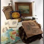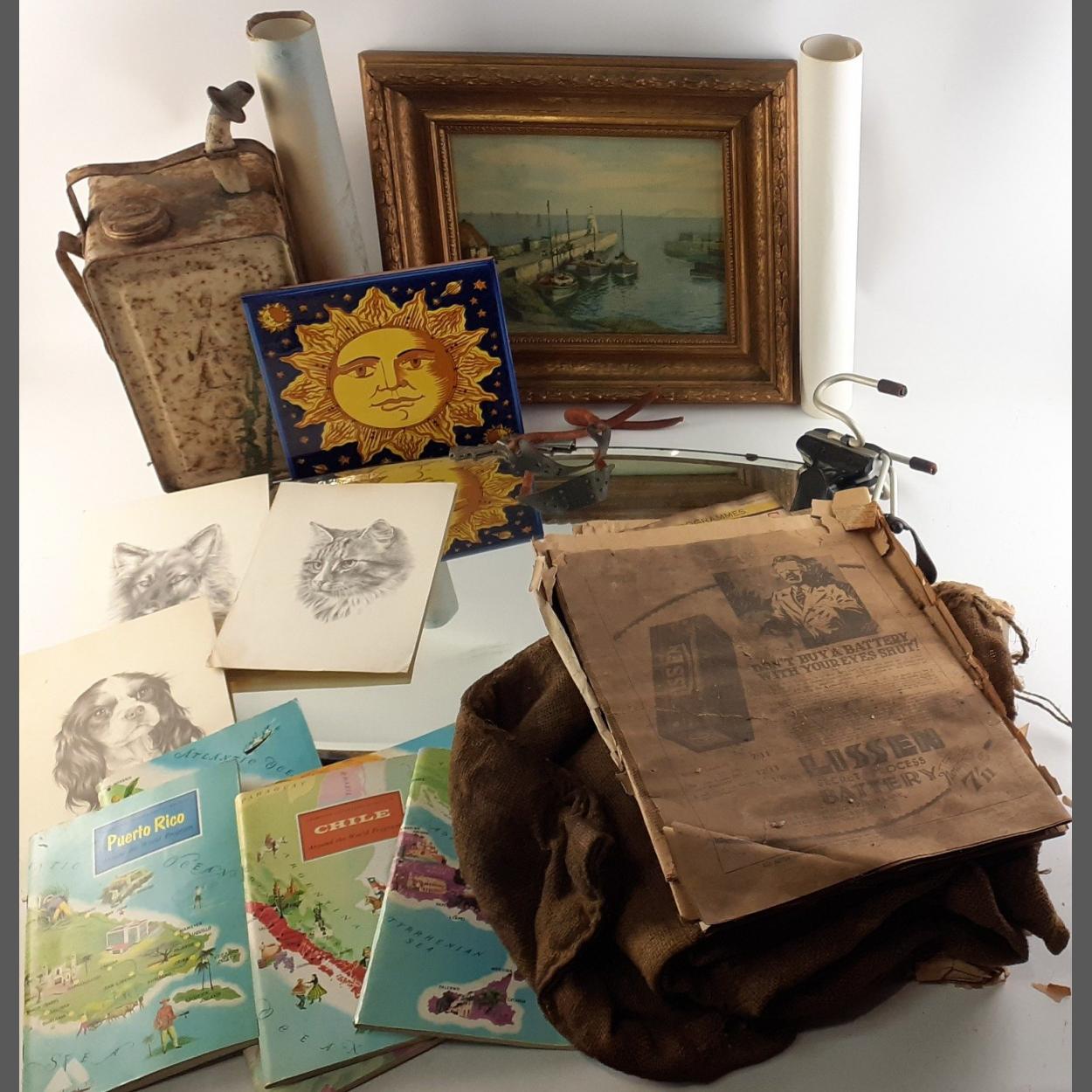 Mixed lot. To include mirror, tile, framed picture, rolled prints, hessian coffee sack, old papers etc.