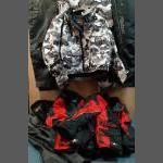 MOTORCYCLE wear in good used condition. A pair of ASHMAN cow hide leather trousers UK size 42, A cammo SPADA jacket and trousers XXL Jacket and XXXL trousers, Two AKITO jackets one XK, one XXL and a pair of AKITO XXL trousers. A good lot.