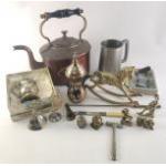 A mixed metalware lot to include pewter tankard, copper tea pot, brass rocking horse and other brass ornaments. christening sets etc.