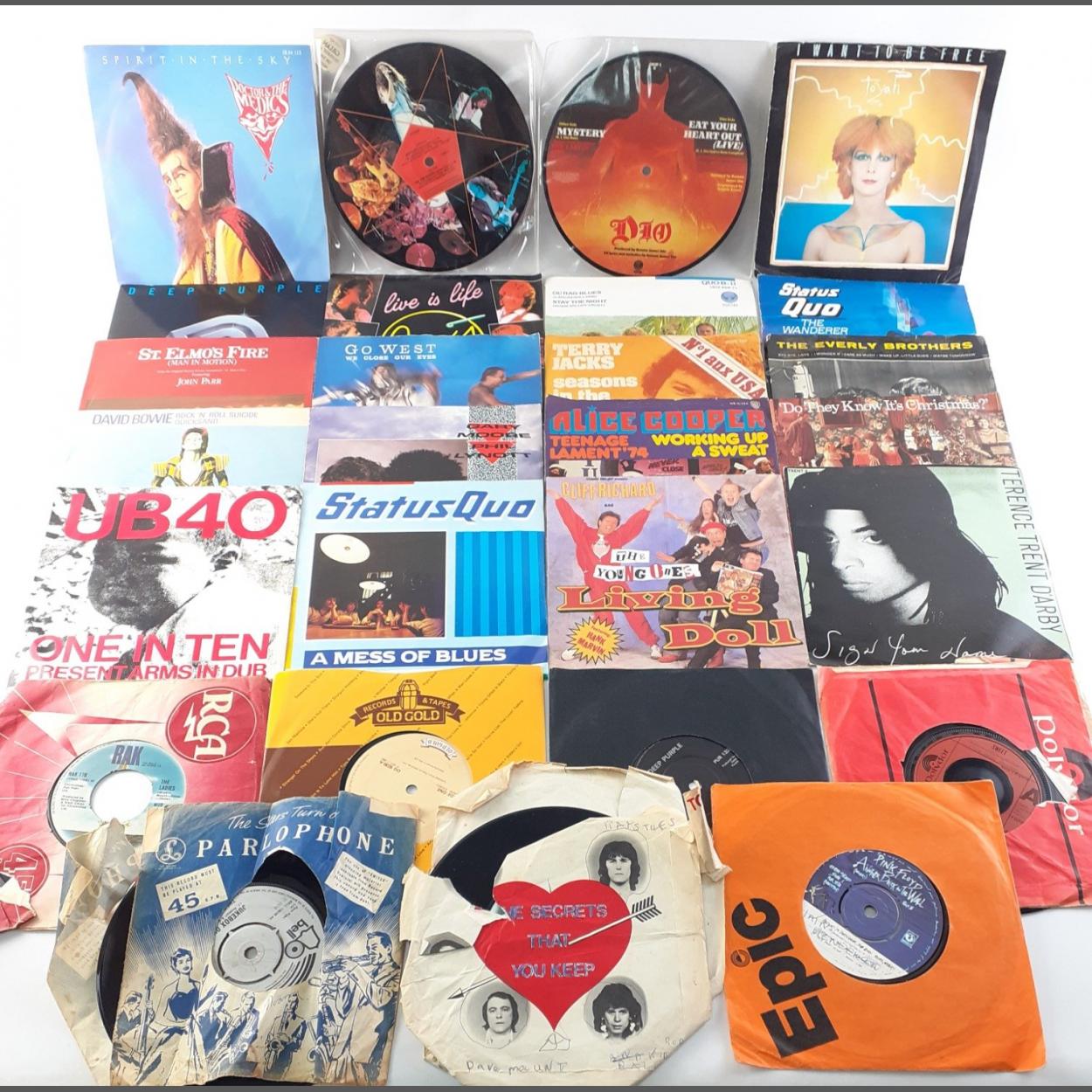 A selection of 45 RPM singles. Mainly 1980s. To include UB40, Starus Quo, Terence Trent D'Arby, David Bowie, Alice Cooper, Go West, Terry JacksT Rex,Deep Purple, Sweet, Pinkk Floyd, Toyah, DIO and others