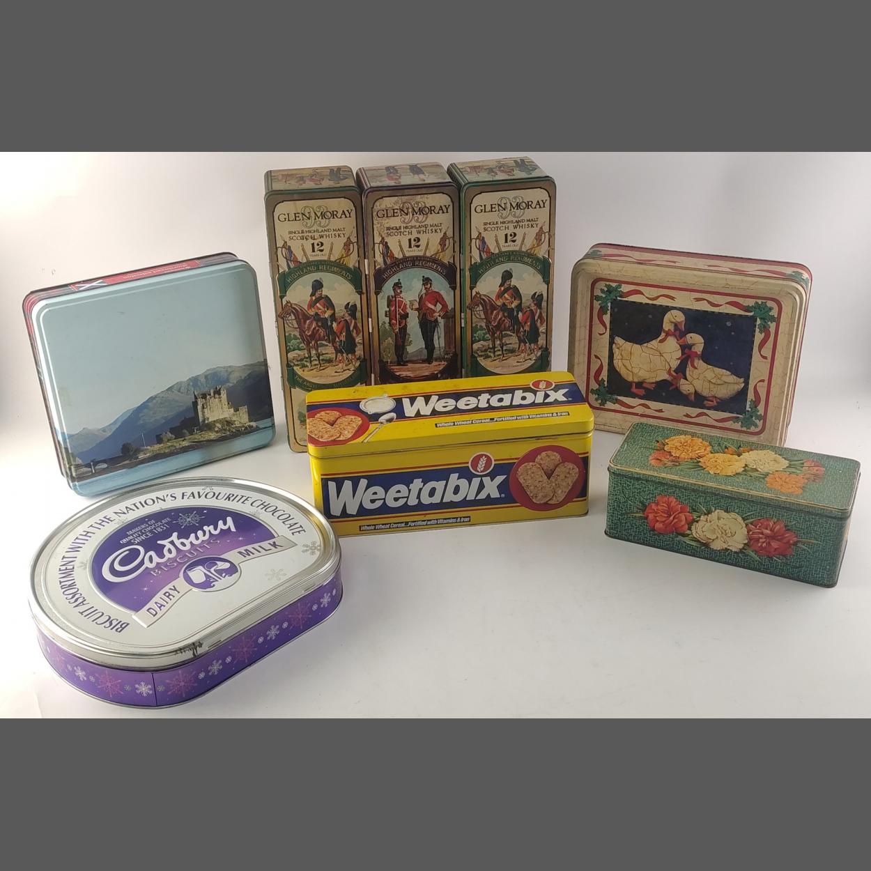 A good collection of handy advertising tins, to include Whisky, Weetabix etc.