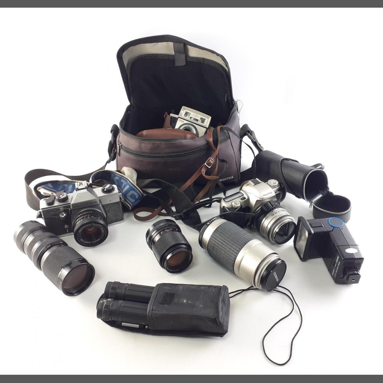 Mixed photography lot. Includes PENTAX MZ50, KENLOCK 85-210mm lens Cosina Lens, Praktika MTL50 and others.