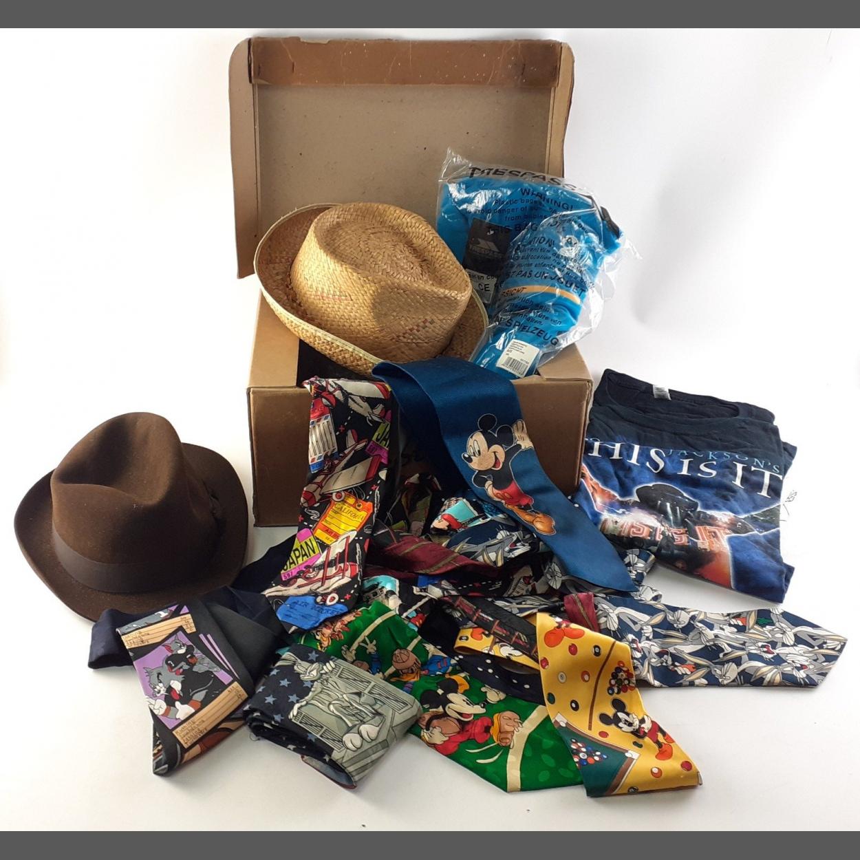 A boxed straw hat with one other and a quantity of Disney themed ties.