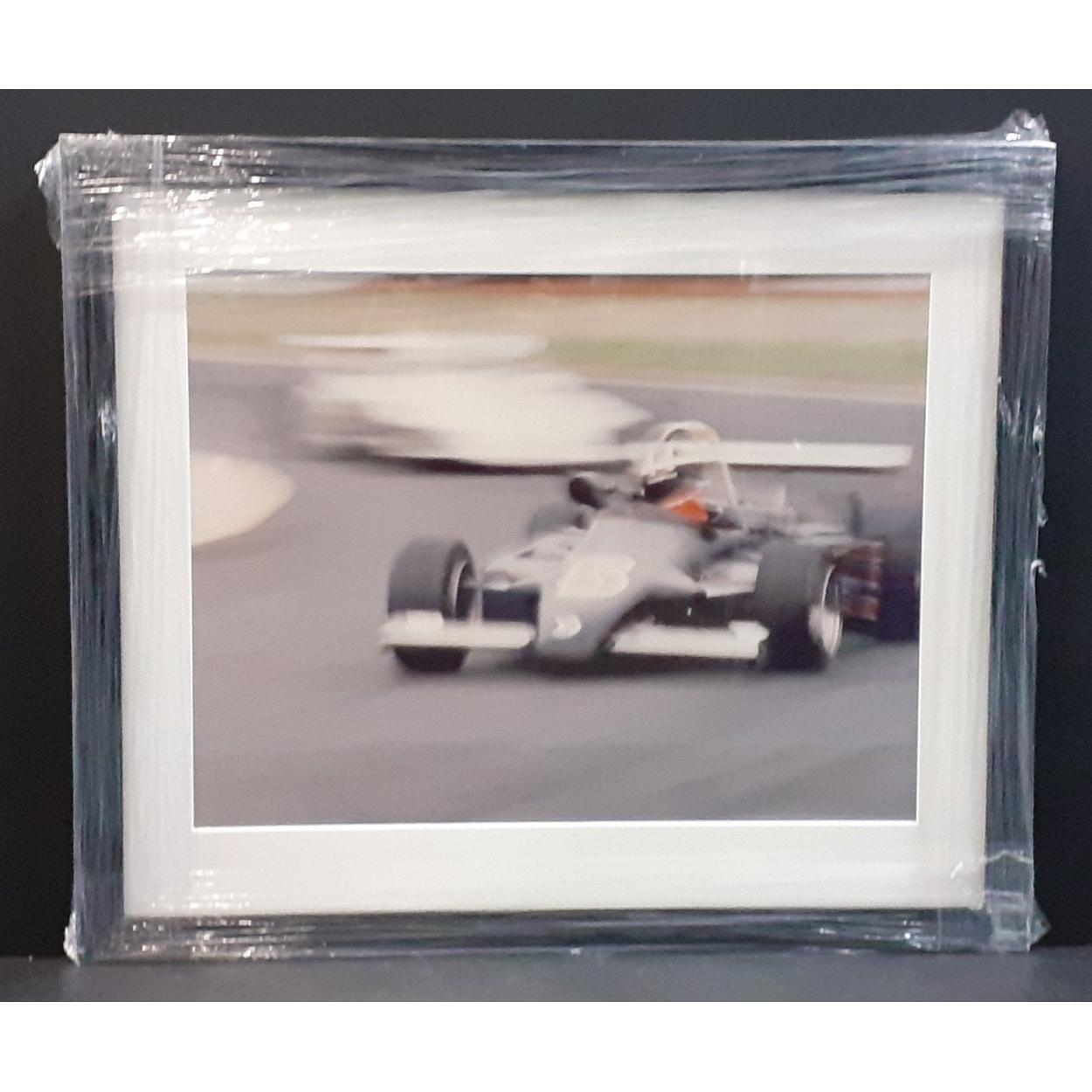 Large Motor Racing Art Print depicting F1 car in action. Unidentified car or driver but a super print of car in motion. Frame size 65cm x 55cm.