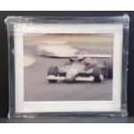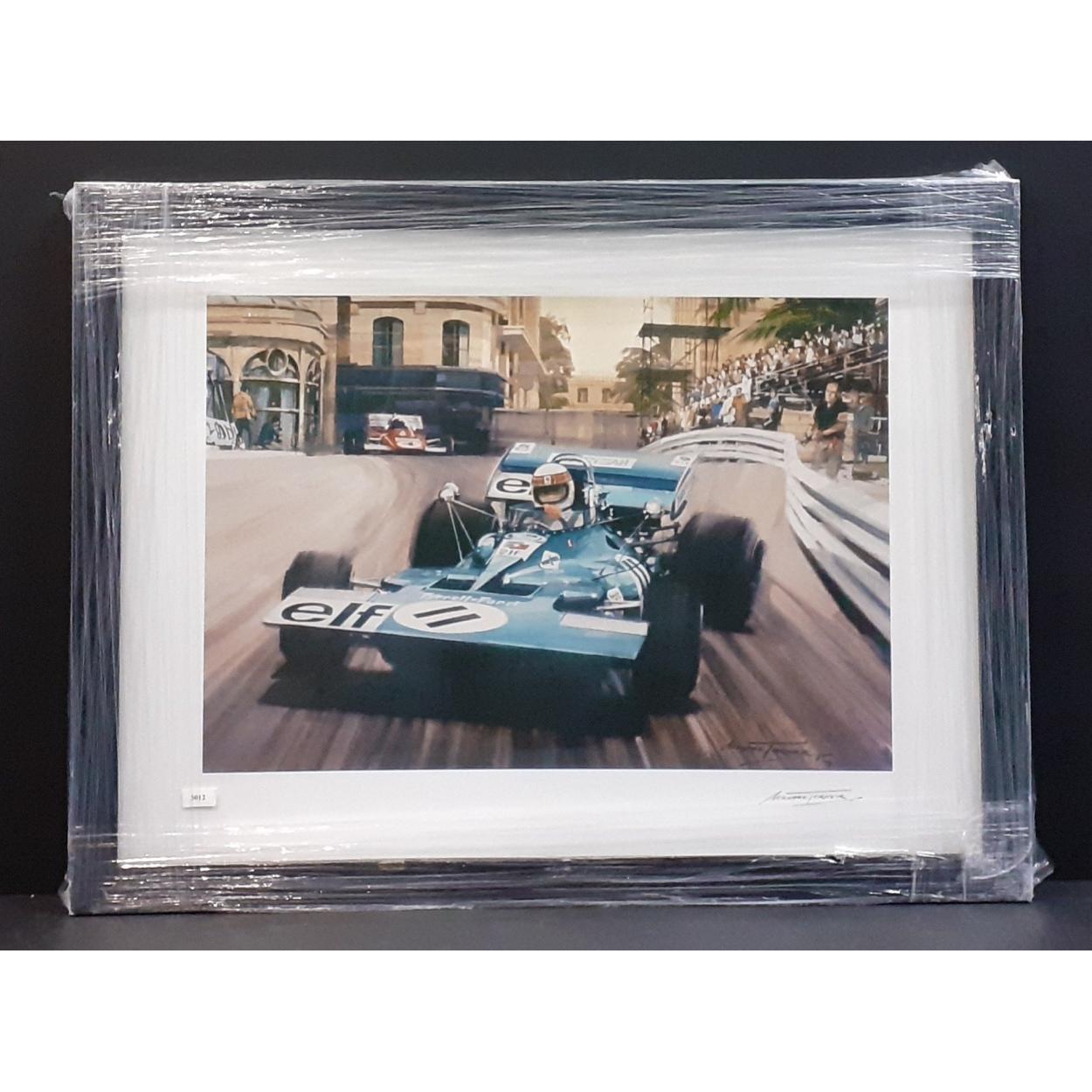 MOTOR RACING art print. JACKIE STEWART in Tyrell Ford at Monaco with Hermitage Hotel in background. Frame size 63cm x 48cm.