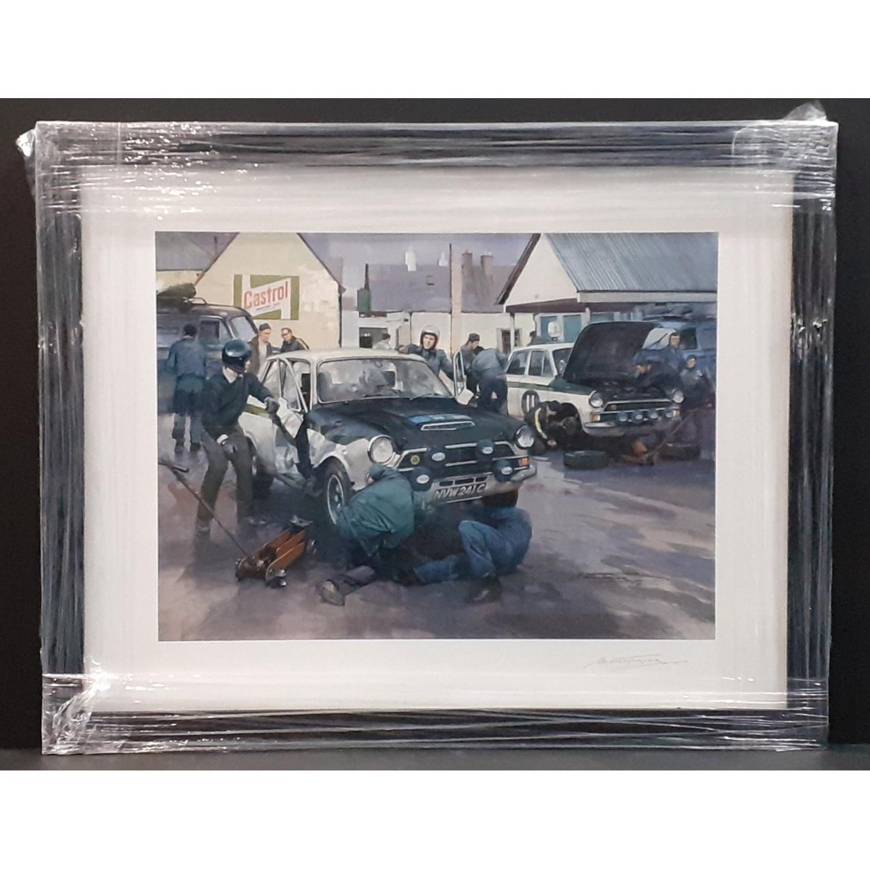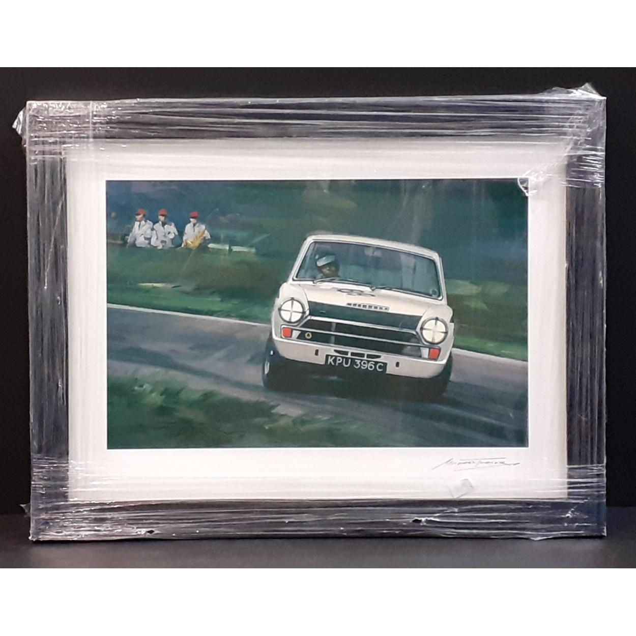 JIM CLARK Motor racing Interest Art print. A beautiful framed print of borders Legend and F1 World Champion JIM CLARK. Signed print by Michael Turner. Depicts Cortina with mechanics during 1966 RAC Rally, with historically accurate damage shown to the Cortinas door. Printed on high quality heavyweight paper Frame size 60cm x 48cm. A stunning piece ready to hang.