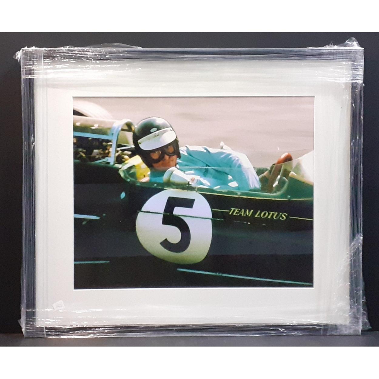 JIM CLARK Motor racing Interest Art print. A beautiful framed print of borders Legend and F1 World Champion JIM CLARK. Depicts Jim in Team Lotus 49 number 5. Frame size 69cm x 59cm. A stunning piece ready to hang.