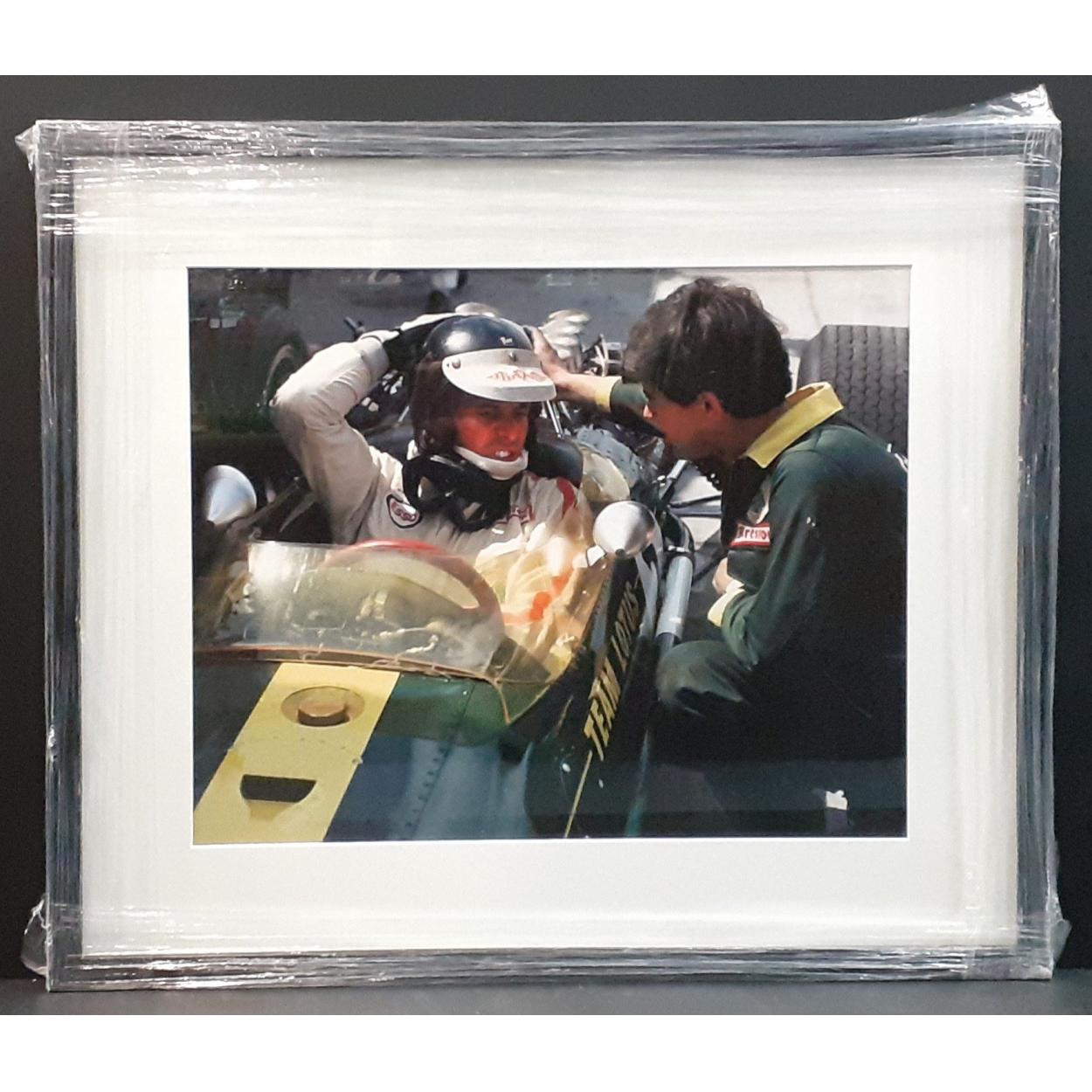 JIM CLARK Motor racing Interest Art print. A beautiful framed print of borders Legend and F1 World Champion JIM CLARK sitting in Team Lotus car in animated discussion with legendary mechanic Keith Duckworth. Printed on high quality heavyweight paper Frame size 69cm x 59cm. A stunning piece ready to hang.