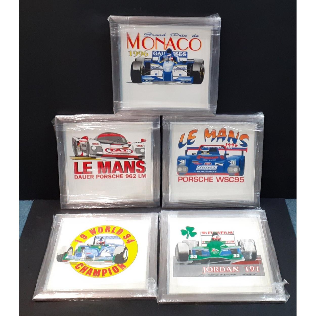 Five superb and stylish wall prints of Motor Racing interest. Includes LE MANS Dauer Porsche 1994, LE MANS Porsch WSC95 1996, 1996 Monaco Olivier Panis, 1994 Michael Schumacher First F1 Championship, Jordan 191 driven by Alessandro Zanardi 1991. All 43cm x 43cm. Six superb wall prints.