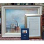 A limited edition Gouttelette on canvas of J.M.W. TURNER's "Fighting Temeraire" from a sold out published edition of only 60 on canvas Worldwide. It will be supplied with an a replacement valuation certificate for £1500 (free of charge) ans a framed Certificate of Authenticity. The quality of this print is of the highest standard, please see photographs which actually pick up the cracking in the paint from the original. Condition is excellent. Please note that the full title is `The Fighting Temeraire Tugged to her Last Birth to be Broken-up, 1838` The original painting was produced in 1839. Turner`s elegy for the age of sail and British Oak embodied in seamen, man-of-war and ships of the line, also ushers in the steam age. Sold like other outdated war ships for the price of her timber, the Temeraire is towed to the breakers by a steam tug. Much later, Turner`s picture was described as his first, almost prophetic idea of smoke, soot, iron and steam. Turner called it his `darling` and refused to sell it. He intended it for the National Gallery which sits in Trafalgar Square named after the battle in which the Temeraire had served and to this day the painting remains in the collection of the National Gallery.. H: 76cm W: 101cm D: 1cm. There are two minor chips to the right edge of frame. A stunning piece.