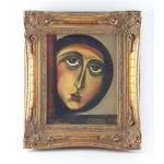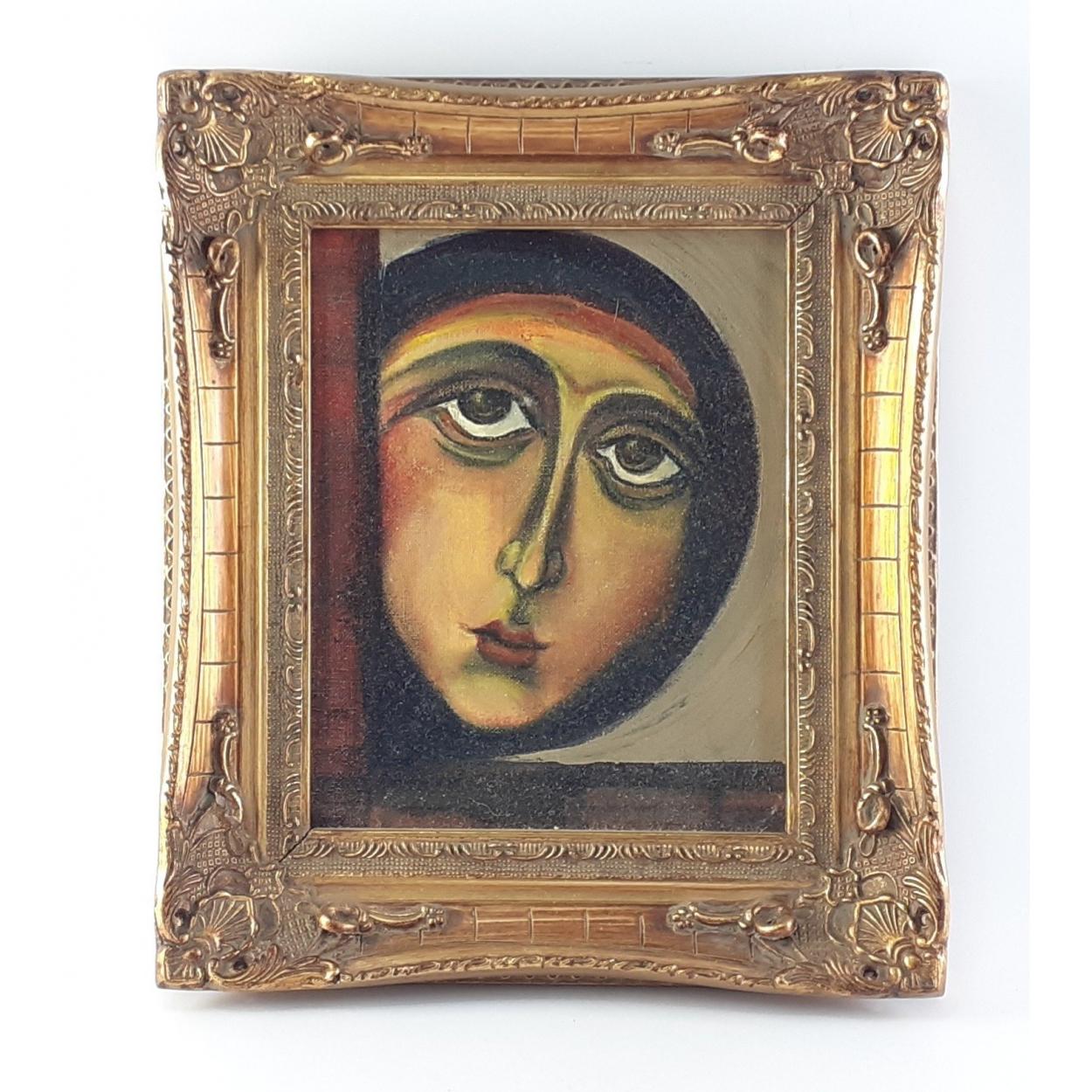 An intriguing devotional Icon-style oil on canvas in ornate gilt frame. Measures 34cm x 31cm