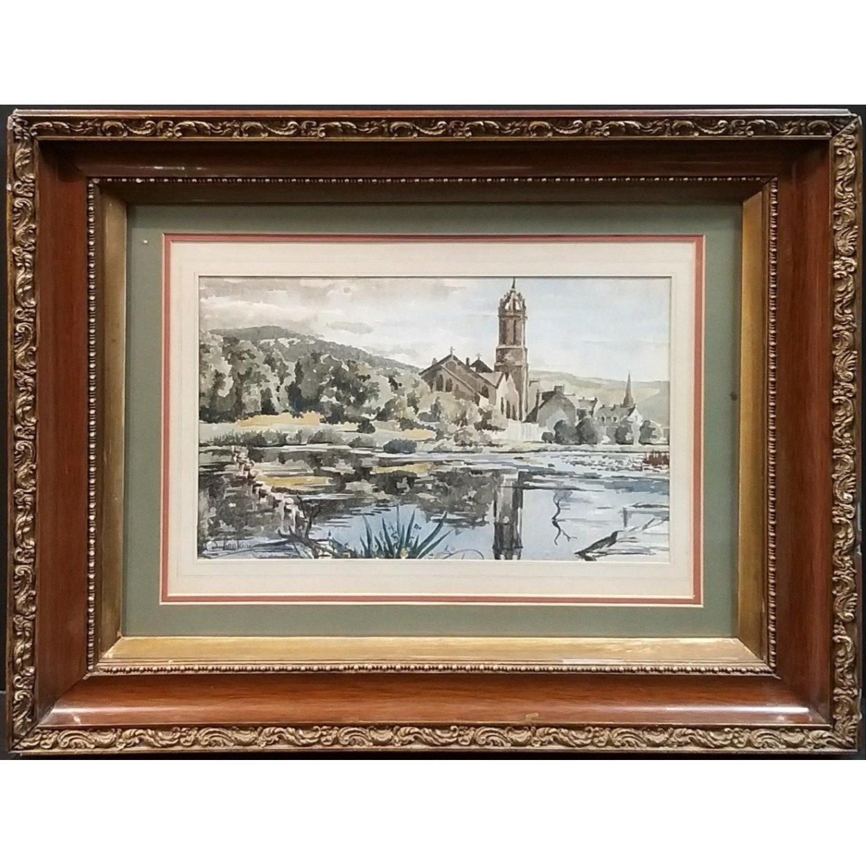 A watercolour on board showing the Parish church in Peebles from across the TWEED. Signed to lower left A.S. RANKINE. Measures 60cm x 52cm approx. Attractively framed.