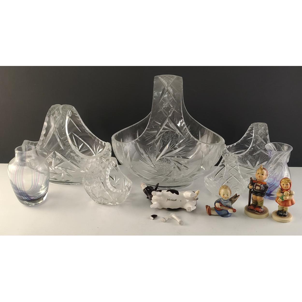 Mixed glassware with a Caithness style small vase and others A BESWICK cow A/F with damaged pieces and three Goebel figures. A pretty lot