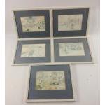 A charming set of 5 watercolour prints frame size 28x24cm, picture size 18x12cm