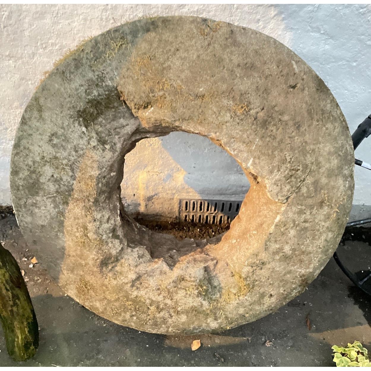 A SUBSTANTIAL SOLID STONE WHEEL garden curio diameter 73cm approx