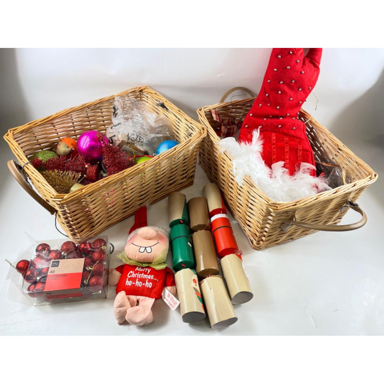 Two useful wicker baskets (40x30x18cm) full of Christmas decorations