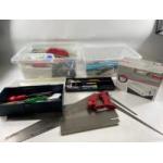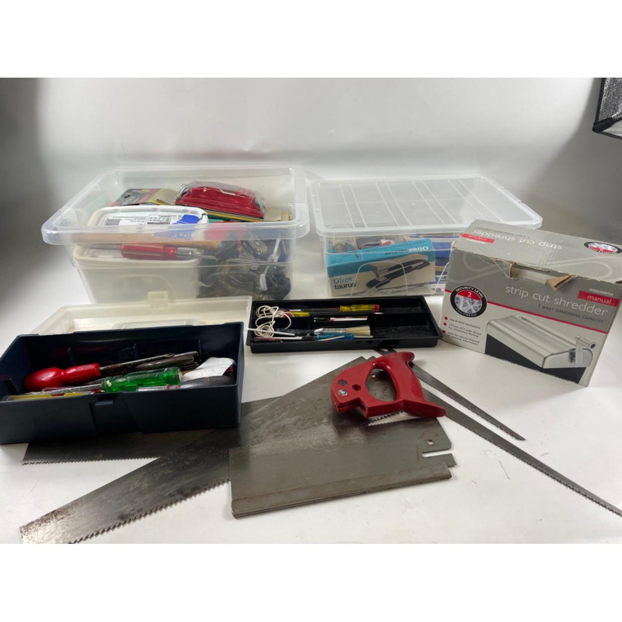 The handy home lot to include a useful handyman kit with a saw, Stanley knife, screwdrivers etc plus supplies for the home office including a stapler, pencils, pencil leads, a Praktica 3.3 mini camera