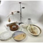 A tea-light candle shade and saucer, an old wall circular barometer, a birds ornament etc