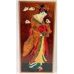 An ORIENTAL wall hanging plaque with a young lady in traditional dress with butterflies - dimensions 36cm height x 17.5cm wide approx