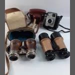 Two cased pairs of binoculars one LE JOCKEY CLUB PARIS and another set of field glasses. Jockey club ones have minor damage to eyepieces but appear optically sound. Lot also includes two cameras, A Brownie Twin 20 and a Comet S.
