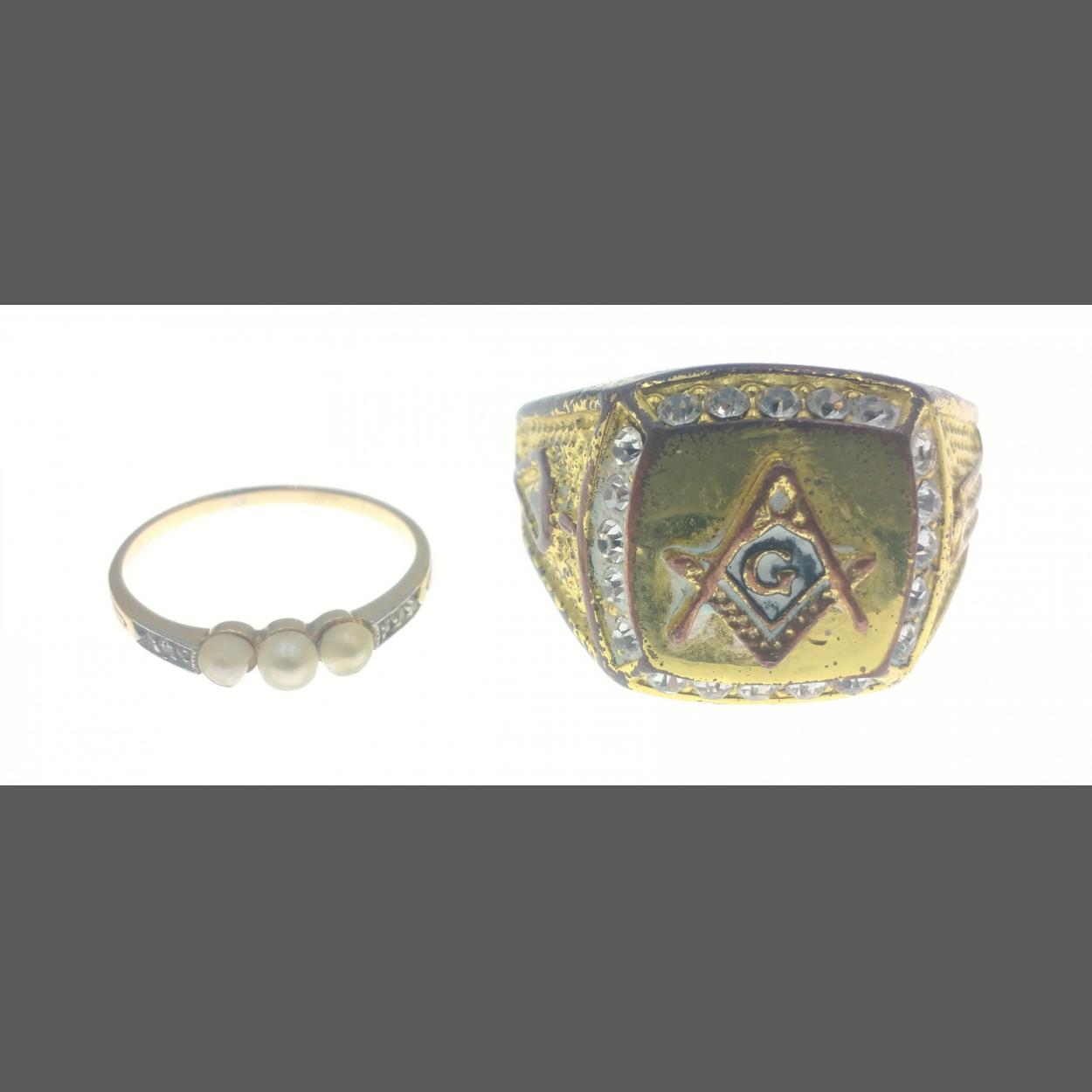 A large gaudy MASONIC symbol ring size Z and one other unmarked yellow metal ring with three seed pearls size K, weight 1.3g approx.