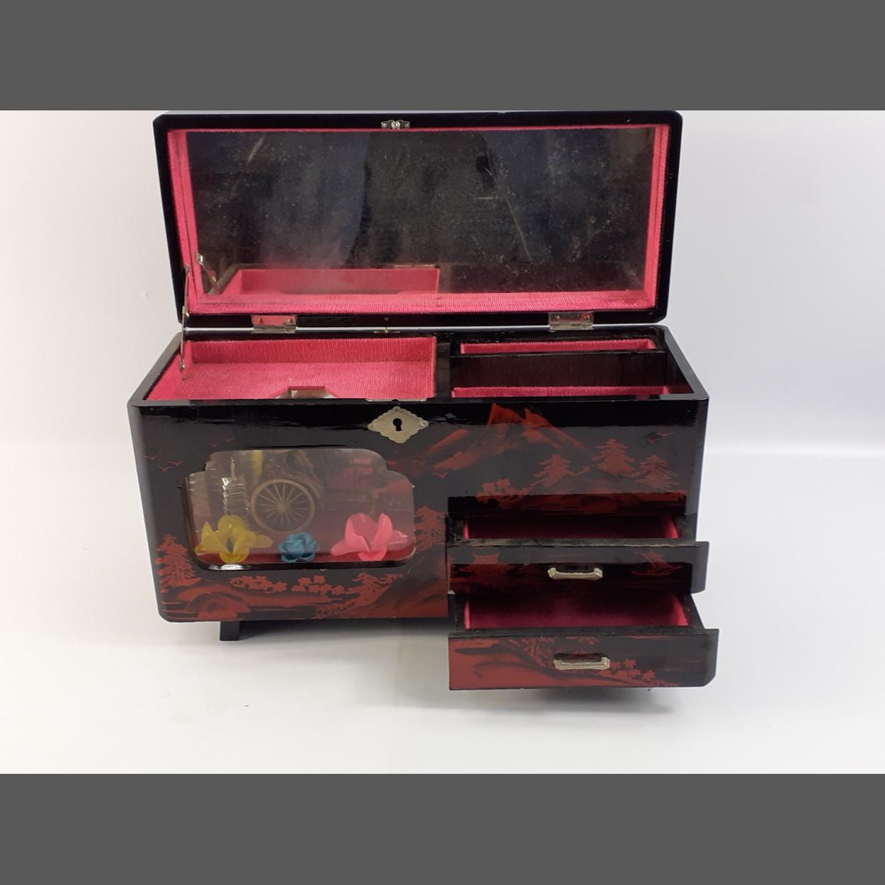 A lovely Oriental Chinese style lacquered jewellery box. 34 x 14 x 20cm approx. Has a see through panel with a traditional rickshaw scene.