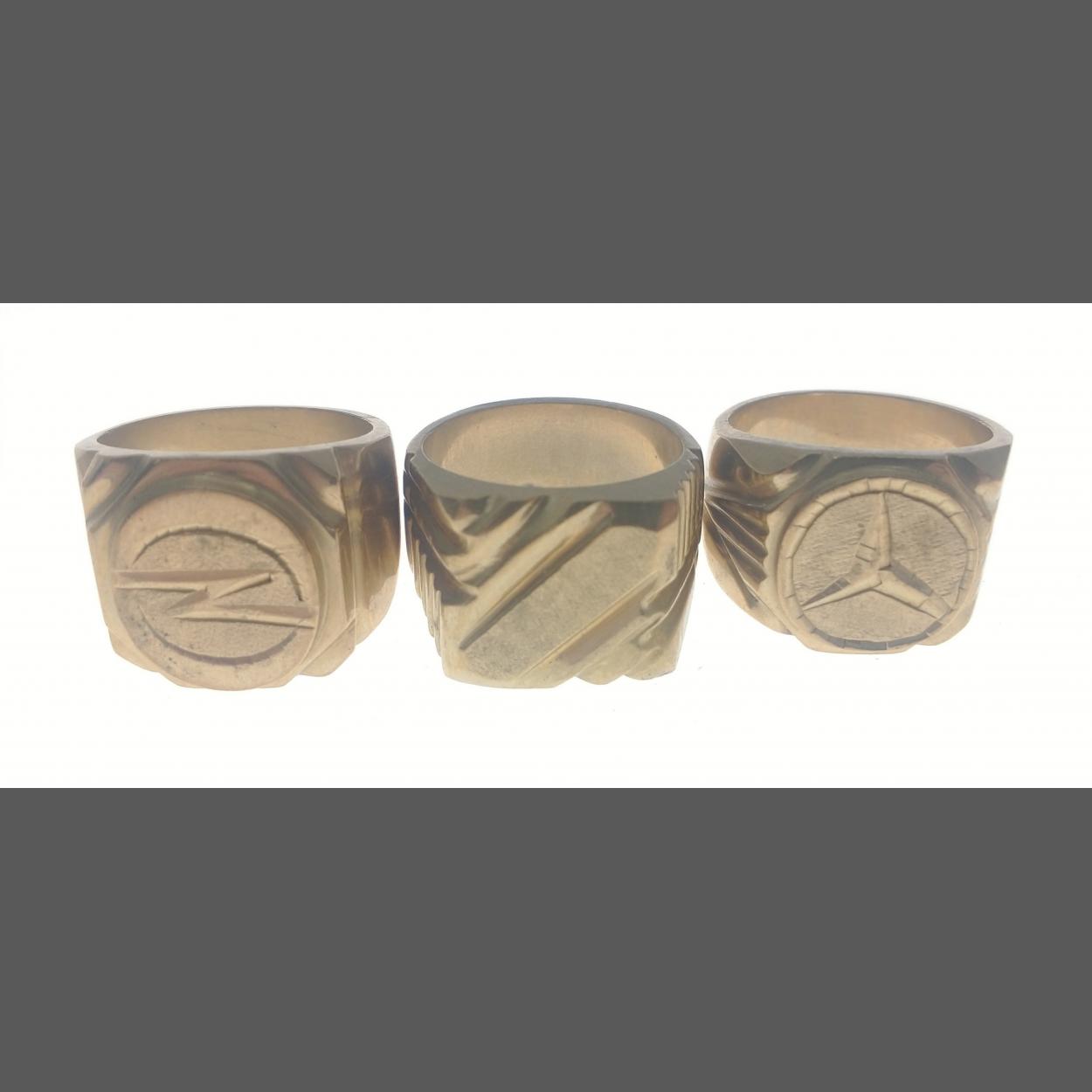 Three chunky gents rings. Yellow metal each stamped 18K 750 but believed brass. Two with COLLECTABLE car logos for Opel and Mercedes.