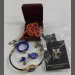 Ward off the evil eye - a small collection of costume jewellery to include a small owl brooch, pair of earrings with turquoise stones, bracelet, pendants, ring (size P) and a coral style necklace