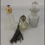 Three glass perfume bottles one with metal dropper. Tallest stands 8cm approx