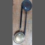 Winter is coming - keep the chills out with these two vintage wooden-handled warming pans, one brass and one copper, each approx 100cm long