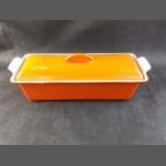 A LE CREUSET (28) volcanic orange enamelled lidded terrine dish 28x11x9cm approx