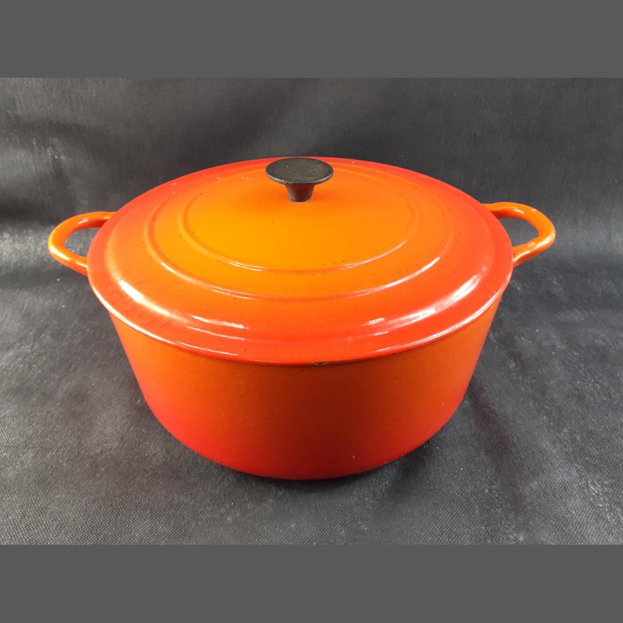 A large volcanic orange LE CREUSET casserole dish (well-used) 27cm dia x12cm