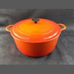 A well-used lidded orange cast iron casserole dish approx 30cm x 20x10cm, (a few small chips in rim) and a well-used orange COUSANCES gratin dish 33cmx21x5cm approx
