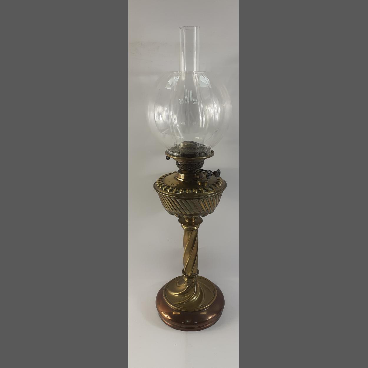 A very impressive British Made brass and copper twisted stem oil lamp with chimney and globe standing approx. 70cm tall. The glass globe does have a crack
