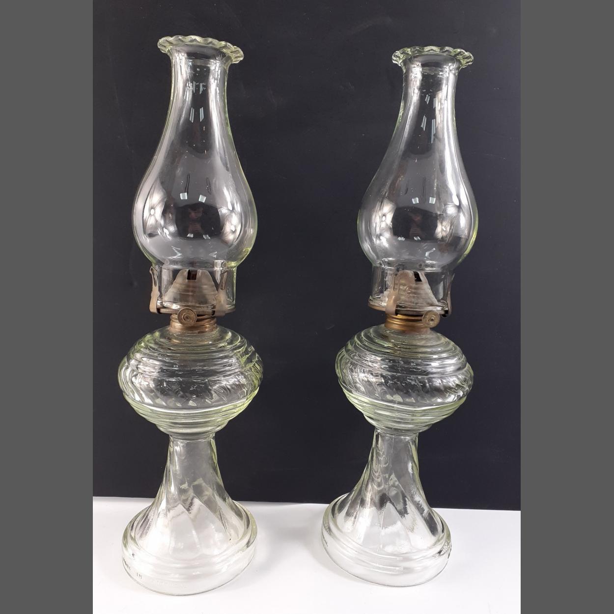 A lovely pair of clear glass Portuguese oil lamps with chimneys. Each stands 41cm tall. Both in nice clean undamaged condition.