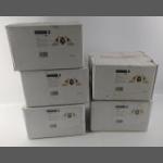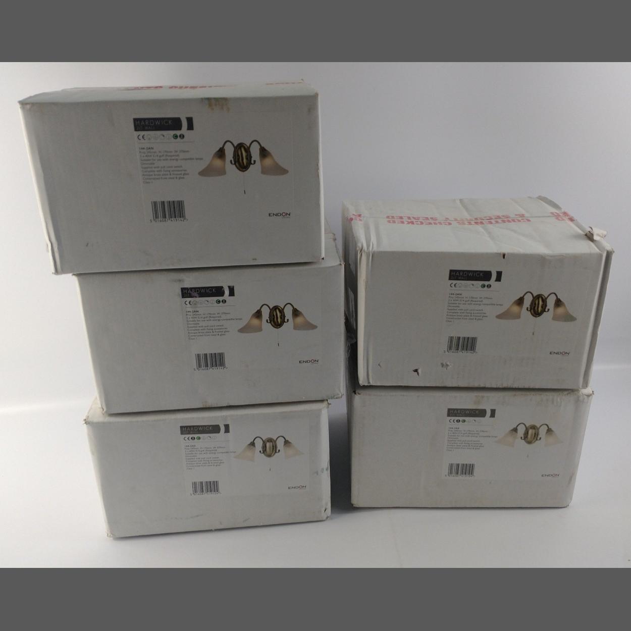 Five unused boxed HARDWICK wall lights antique brass plates and frosted glass shades, model 144-2AN suitable for 2 x 40W bulbs (24x17x37cm)