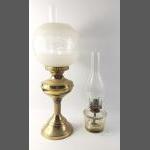 Two oil lamps the smaller Wee Willie Winkie style approx 38cm tall, glass based and the larger one glass and brass 57cm high