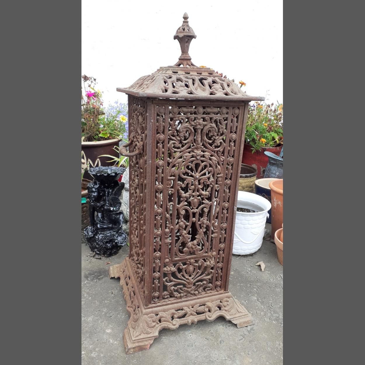 A rather impressive cast iron free-standing Cathedral sanctuary lantern stamped RIPPINGILLES ALBION LAMP. Stands 60cm high approx. Opening lid and rear door. A very impressive piece with light surface rusting finish.