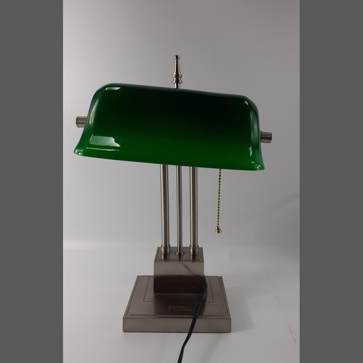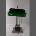A modern retro banker's desk lamp with green glass shade. Chrome base with a brass light pull. Appears to have Dong Lian stamped on base. A very stylish lamp with a great look. Does seem to sit lightly askew.