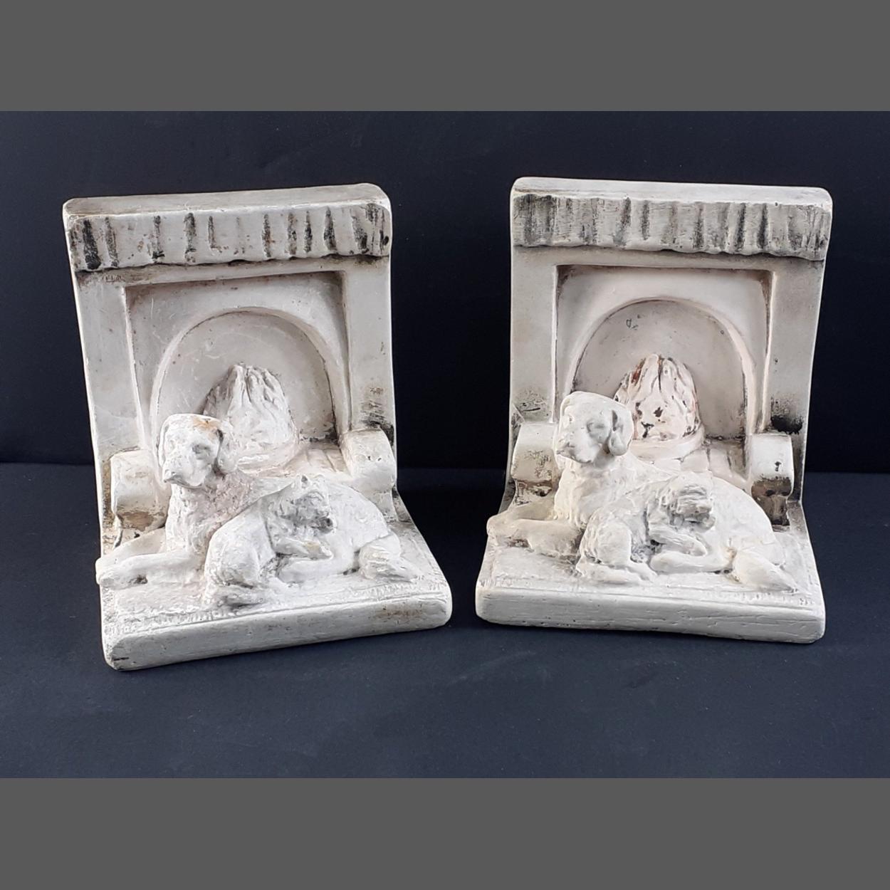 A pair of vintage ARTISCO fireplace bookends with homely cat and dog enjoying the flames. Stand 15cm high, depth 13cm approx. Could do with a light clean.