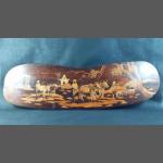 A large vintage marquetry plaque with a pastoral scene of ploughing and goat-herding approx 90cm long. Chip missing from one corner