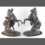 A pair of bronze ''THE MARLY HORSES.'' after Charles CROZATIER (1795 - 1855). The sculptures are representations of two monumental sculptures made by Guillaume Coustou The Elder (1677-1746) called The Marly Horses after the chateau where they were first commissioned in 1739. Today the original marble statues grace the Louvre in Paris. A truly stunning fine pair of bronzes known as 'horse tamers' or 'horses restrained by grooms'. This pair are superbly cast and carry lovely deep rich patination. Believed French circa 1880. Each standing 40cm approx. Condition excellent, on close inspection an older non-obvious damage repair was noted to one tail. Small indistinct foundry mark noted on one base. One has a screw at Grooms hip through to saddle the other has a hole here. Clearly of a superior manufacture these display beautifully.
