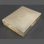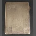 A VINTAGE SILVER cigarette case hallmarked Birmingham 1960 with cedar interior. Uninscribed cartouche, minor dents overall condition excellent. 11cm x 9cm approx. Total gross weight 239g approx