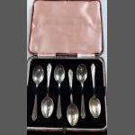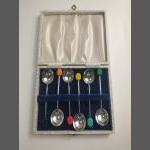 A boxed set of six SILVER hallmarked, Sheffield 1958, coffee spoons with Harlequin coffee bean finials. Each measures 9cm approx, gross weight 35g approx