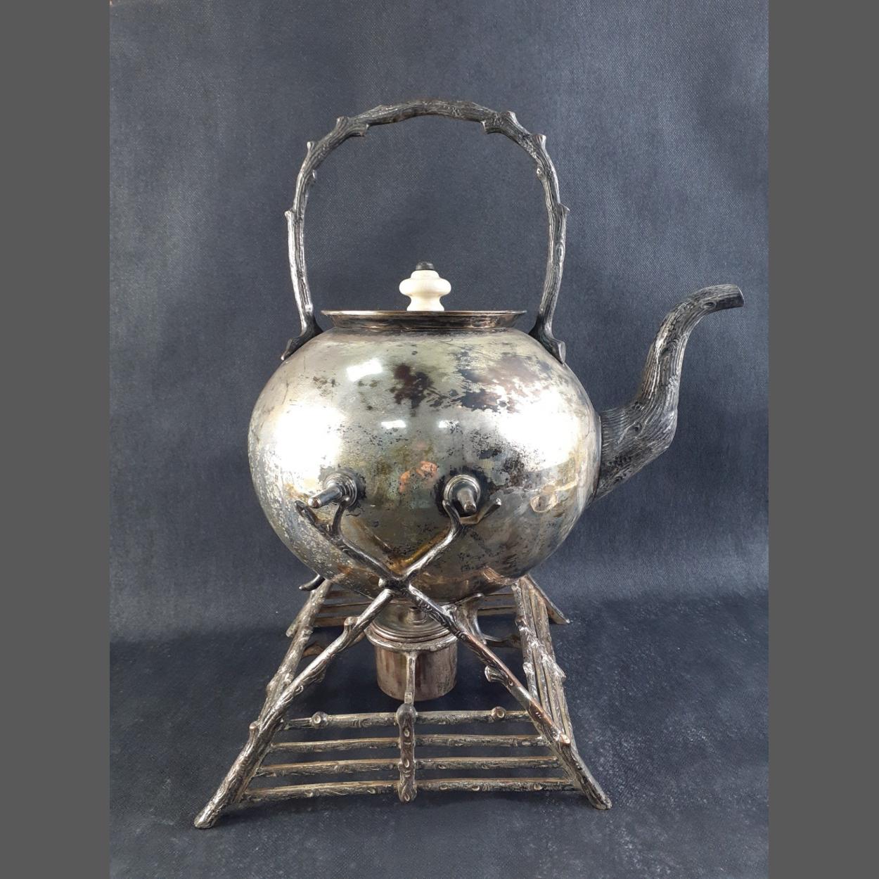 A large complete white metal spirit kettle decorated to resemble wood, stands approx 40cm tall
