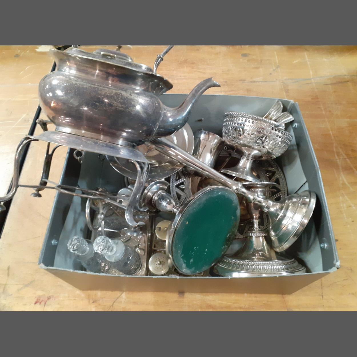 A great lot of PLATED SILVER EPNS items to include candlesticks, various trays, hip flasks, condiments etc. A nice substantial lot.
