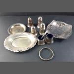 A lovely little collection of silver plated small dishes and condiment pieces including two Walker and Hall pots with Bristol Blue glass liners and matching spoons.