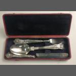 A SILVER boxed monogrammed set of cutlery comprising a knife, spoon and fork, hallmarked Birmingham 1845, each approx 15cm long, weight 77.9g approx, knife damaged