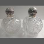 A pair of UNUSUAL ANTIQUE CUT GLASS bottles, hallmarked Birmingham 1896 (one with slightly damaged lid). Each bottle stands approx 16cm high with glass stoppers intact. Makers H&T.