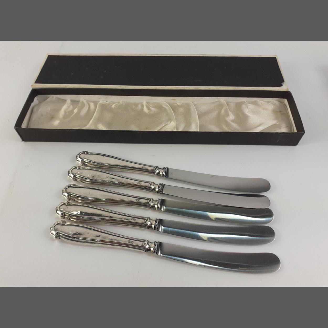 Five butter knives with silver hallmarked handles, Sheffield 1924, each 18cm long approx, gross weight 122g approx
